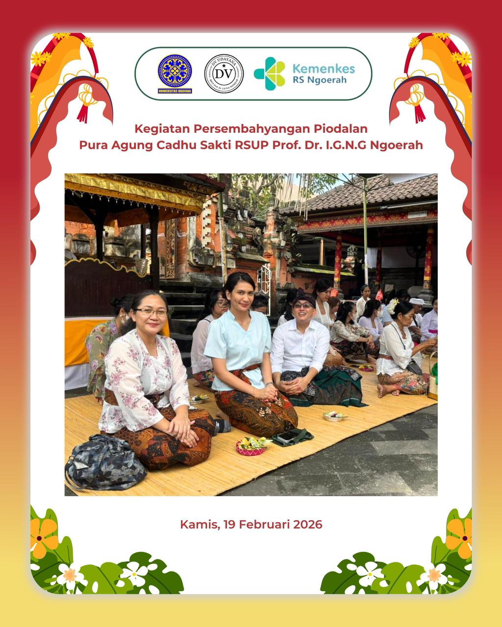 Keluarga besar Departemen/KSM Dermatologi dan Venereologi FK Universitas Udayana/RSUP Prof. Dr. I.G.N.G Ngoerah melaksanakan Kegiatan Persembahyangan Piodalan Pura Agung Cadhu Sakti RSUP Prof. Dr. I.G.N.G Ngoerah 19 Februari 2026